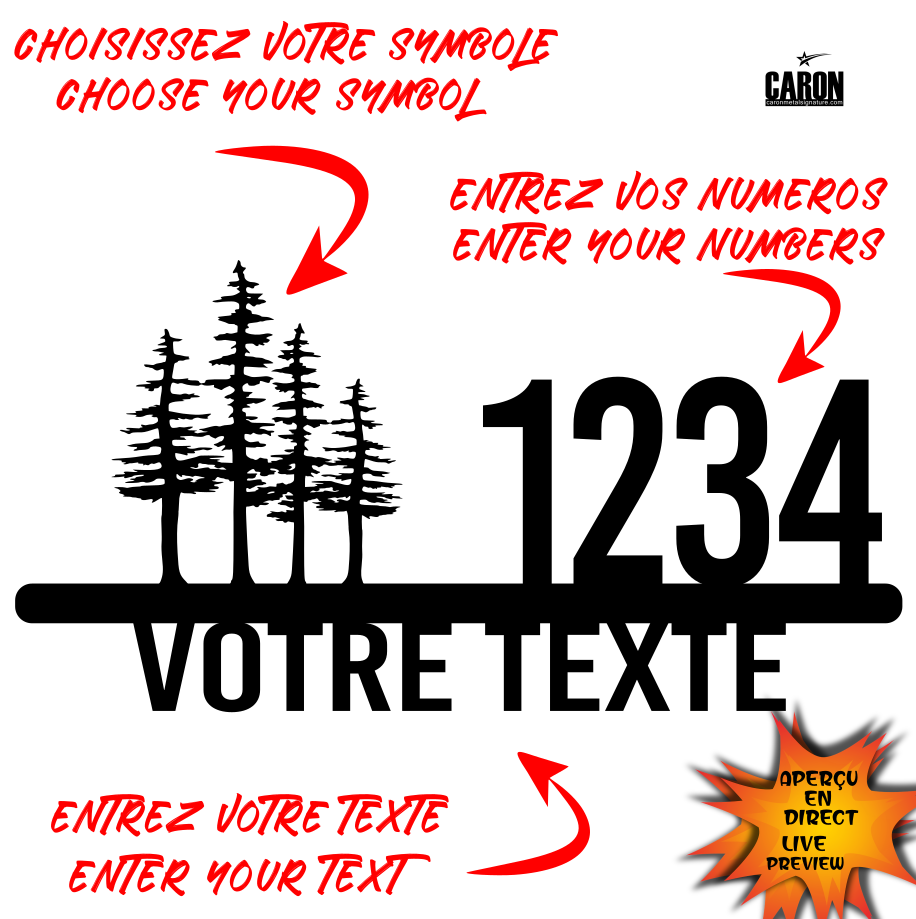 Concevez vous-même votre plaque d’adresse civique et voyez le résultat en direct. Personnalisez chaque détail facilement pour une adresse qui vous ressemble.